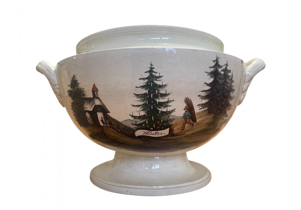 Vzácná empírová terina z počátků výroby kameniny ve Staré Roli. Na terině jsou ručně malované výjevy Podzim a Zima.  Značena Je tlačenou značkou Alt Rolau.