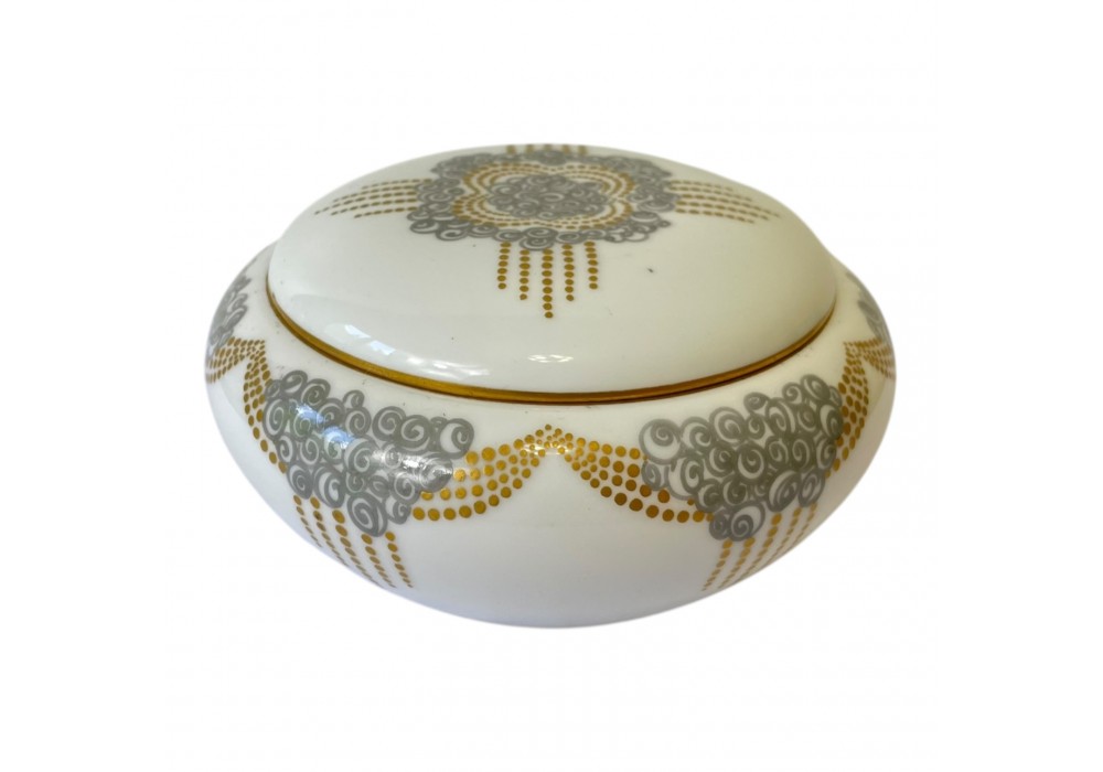 Bonboniéra z jedné z nejlepších porcelánek, porcelánky Sévres. Dekor je ručně malovaný a ovlivněný pozdně secesním uměním. Dekor v roce 1924 vytvořila malířka a dekoratérka Marcelle Deshayes. Návrh dózy se dochoval na grafickém listu, který pro ukázku přikládám a který je uložen v Národním muzeu keramiky v Sévres. Dóza je v perfektním sběratelském stavu.