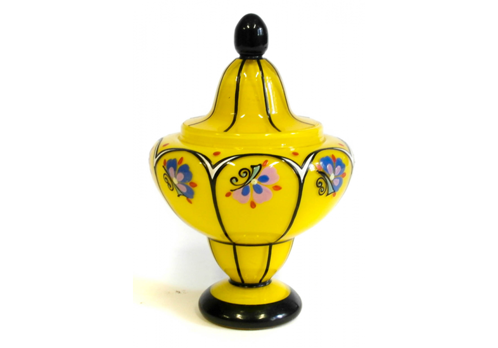 Výrobce: Čechy | Skleněná dźa z tzv. tango skla. Sklo populární na počátku 20. st. Kdy byl populární tanec tango a žlutá barva na dóze představovala kostým tanečnice a černé linky oblek tanečníka. |