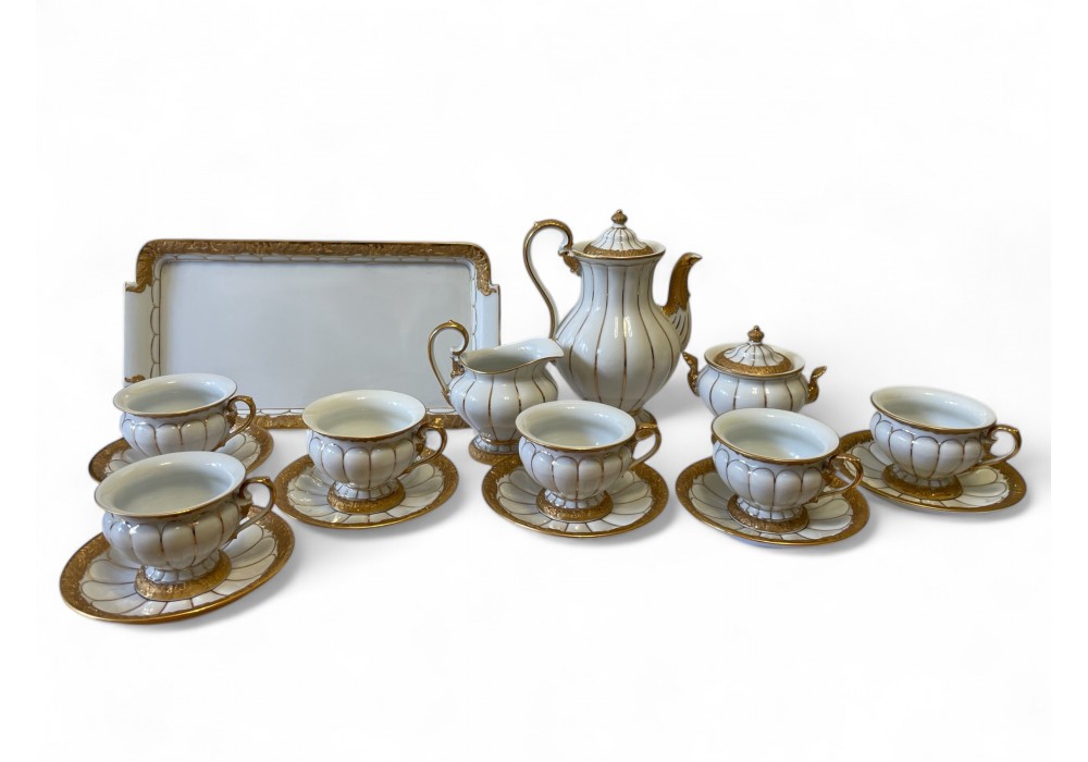 Výrobce: Míšeň Datum výroby: 1979 Š × V × H: 13,5 x 17,5 x 9,5 cm (konvice) Materiál: porcelán Stav: perfektní | Servis na kávu z míšeňské manufaktury. Podle barokní formy. Druhá jakost porcelánu. Krásné jemné detaily formy. Lesklé a matné zlacení. |